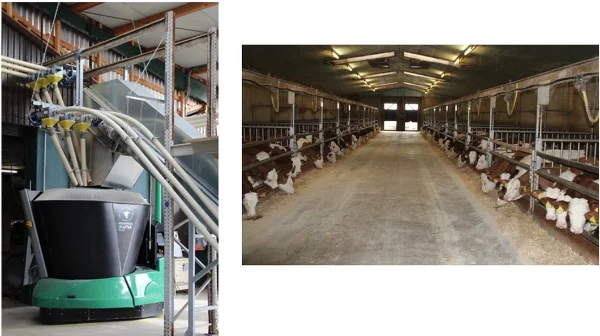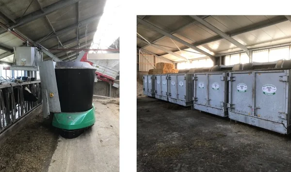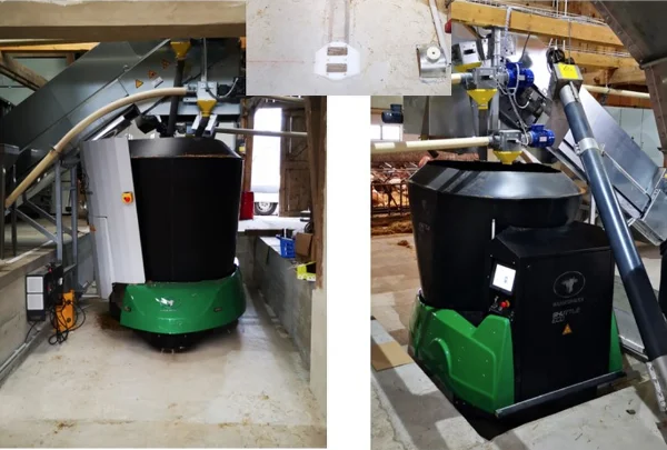- Plnění robota pomocí velkých zásobníků, které krmivo nařezají podle potřeb