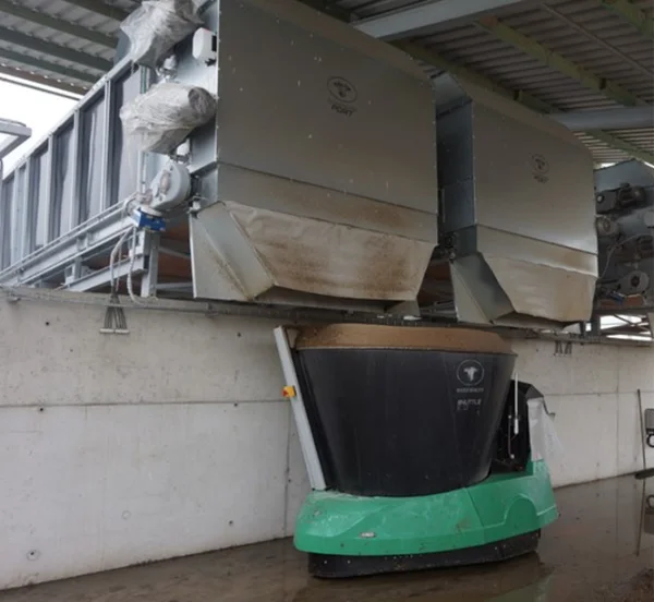 Shutle Eco je napájen pomocí inovativní nabíječky. Pro ušetření energie v bateriích se robot naplní v krmné kuchyni, vrátí se na nabíječku a zapne míchání krmiva.